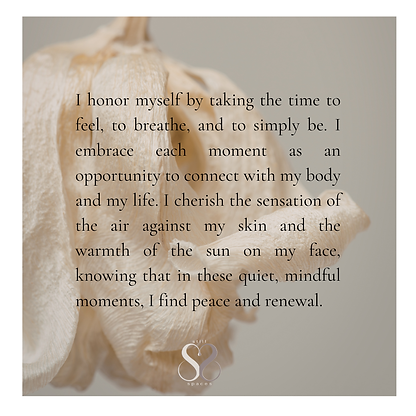 I honor myself by taking the time to feel, to breathe, and to simply be. I embrace each moment as an opportunity to connect with my body and my life. I cherish the sensation of the air against my skin and the warmth of the sun on my face, knowing that in these quiet, mindful moments, I find peace and renewal.